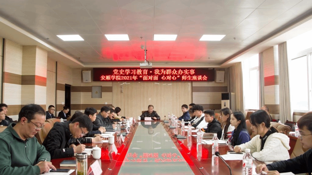 作为党史学习教育“我为群众办实事”的一个重要举措,10月19日下午,安顺学院2021年“面对面,心对心”师生座谈会在特教大楼6楼会议室召开。校长陈云坤、副校长张来出席会议。各学院学生代表17人,党政办、宣传部、学工部、教务处、质评中心、招就处、后勤处、保卫处、校团委负责人和其他有关人员参加座谈会。会议由张来主持。