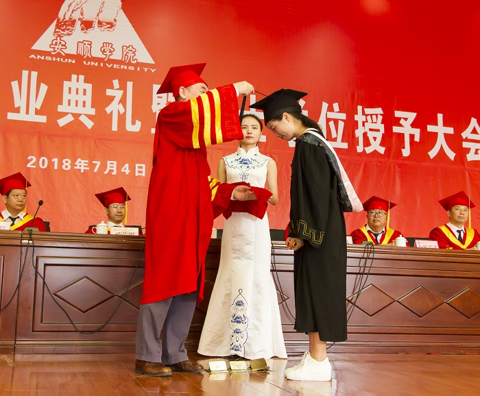安顺学院院长、学位评定委员会主任刘雷教授为获得学士学位的学生代表授予学位