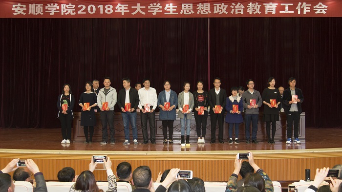 在陶文彩副书记、熊国敏副院长、郭本华副院长分别宣读各级各类先进集体和优秀个人表彰文件后,学校领导依次为获得省级2017年度、校级2016-2017学年度先进班集体;优秀学生干部、“三好”学生;2017年度国家奖学金、国家励志奖学金的学生;2016-2017学年度优秀专职辅导员、优秀班主任;2017年度思想政治理论课优秀教师;2018年暨第四届辅导员职业技能大赛等次奖和安顺学院2017年度精神文明建设“五个优”获奖者等各级各类先进集体和个人颁奖。