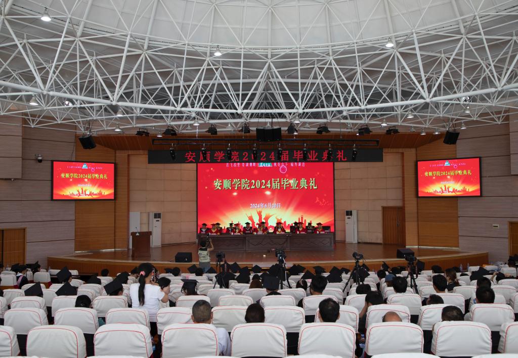 时光荏苒,毕业季如期而至。2024年6月20日下午,安顺学院2024届毕业典礼暨学士学位授予仪式在学术报告厅隆重举行。安顺学院党委书记罗荣彬,校长曾丽,党委委员、纪委书记、监察专员蔡红英,党委委员、副校长殷红敏,党委委员、组织部部长何朝越,党委委员、统战部部长、教务处处长杜志明,校学士学位评定委员会部分委员、各二级学院党委书记、副书记、辅导员、班主任、其他教师代表、毕业班同学亲友、驻校服务机构人员、安顺职业技术学院联合办学点和铜仁职业技术学院联合办学点的我校部分同学及其带队老师出席毕业典礼,共同见证2834名学子圆满完成学业,踏上人生新征程。典礼由罗荣彬主持。
