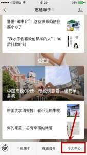 2.进入“惠通学子”公众号,点击右下角的“个人中心”,按提示步骤进行新用户注册。