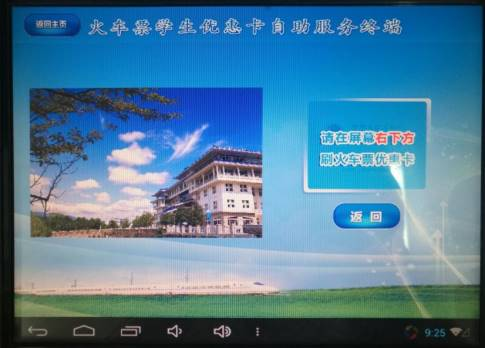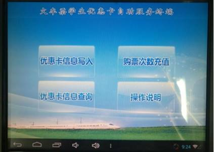 2、火车票学生优惠卡自助服务终端主界面: